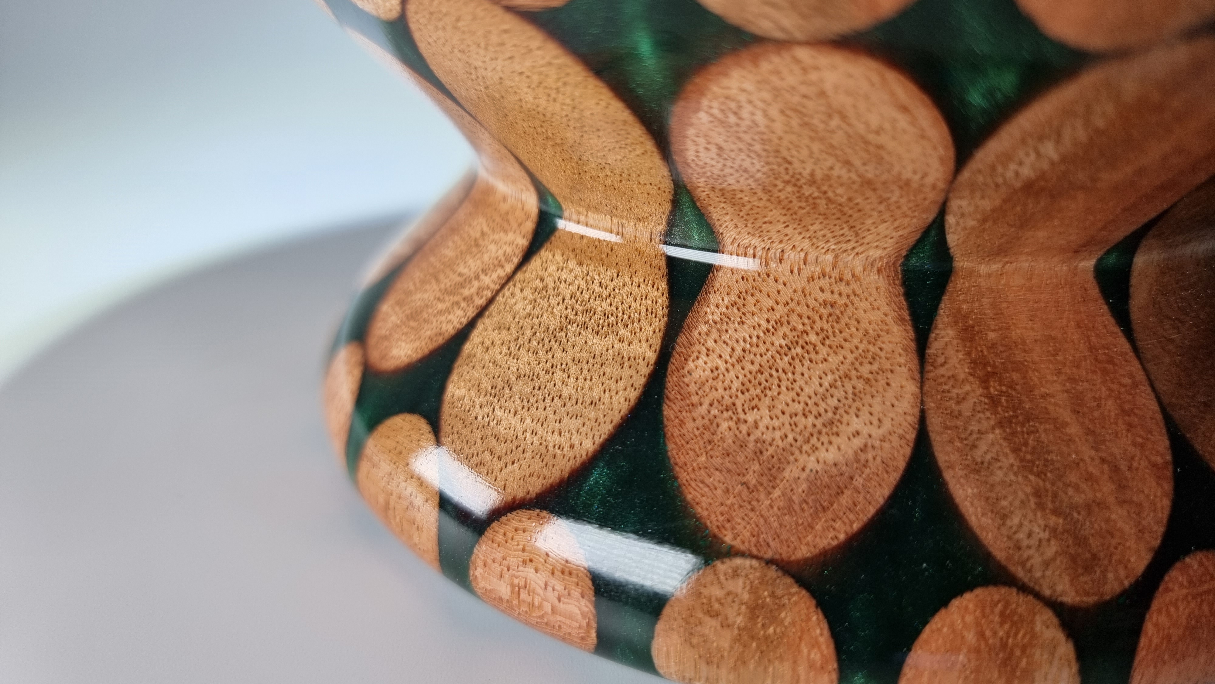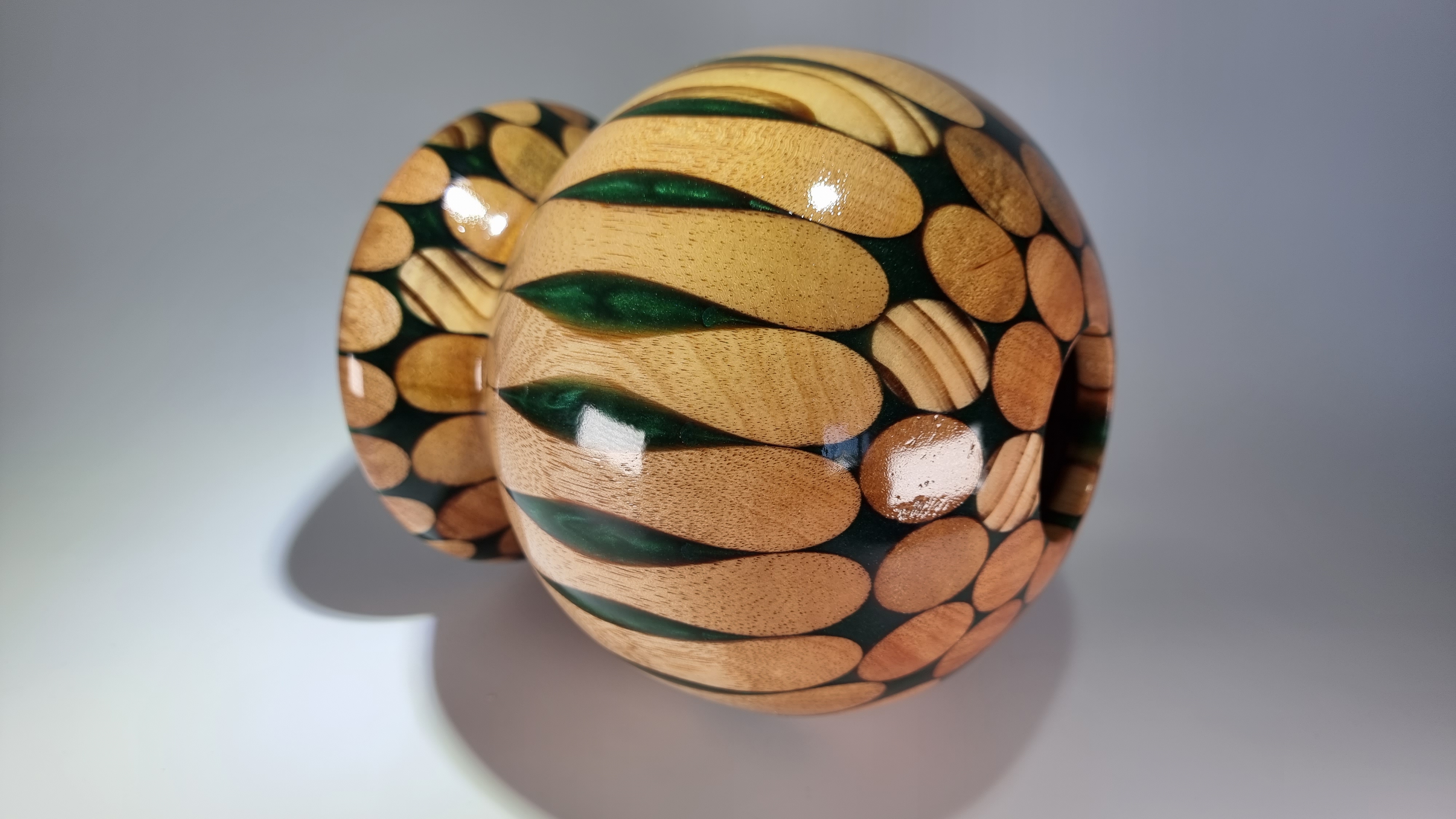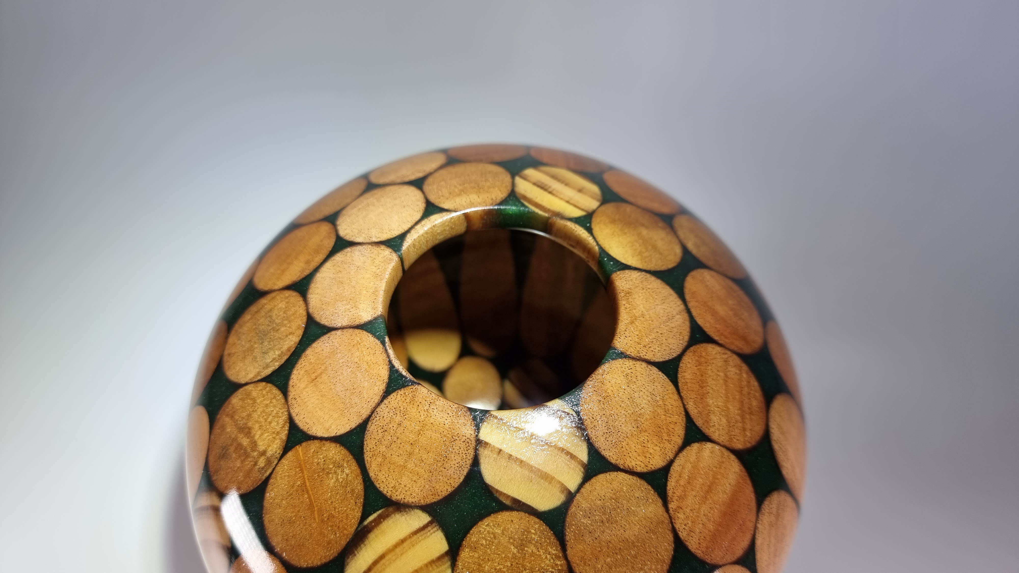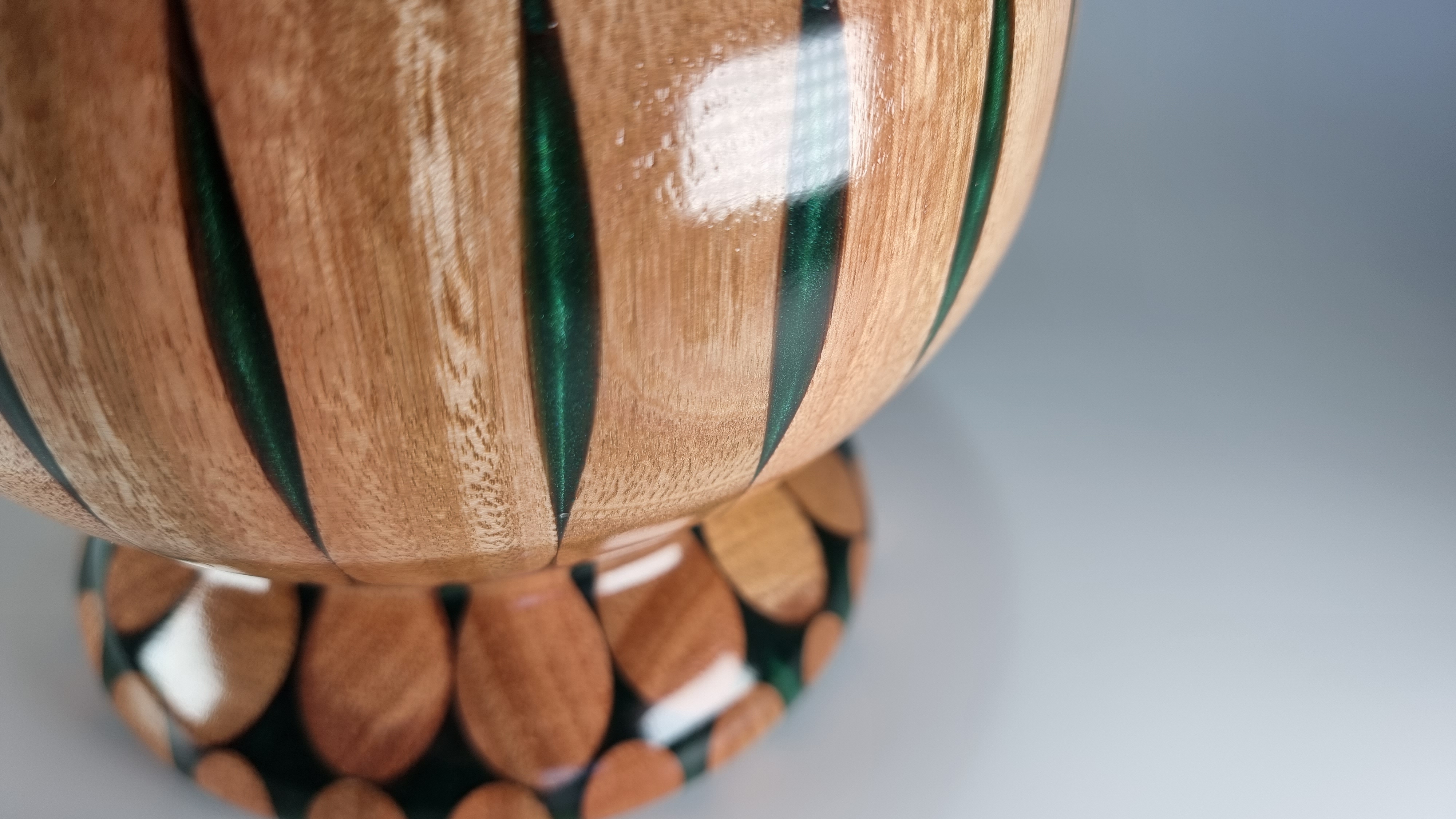This piece is turned from 10 hardwood broom handles cast in forest green resin and finished in a clear lacquer coat . Unusual but a striking centre piece or for use with dry flowers.