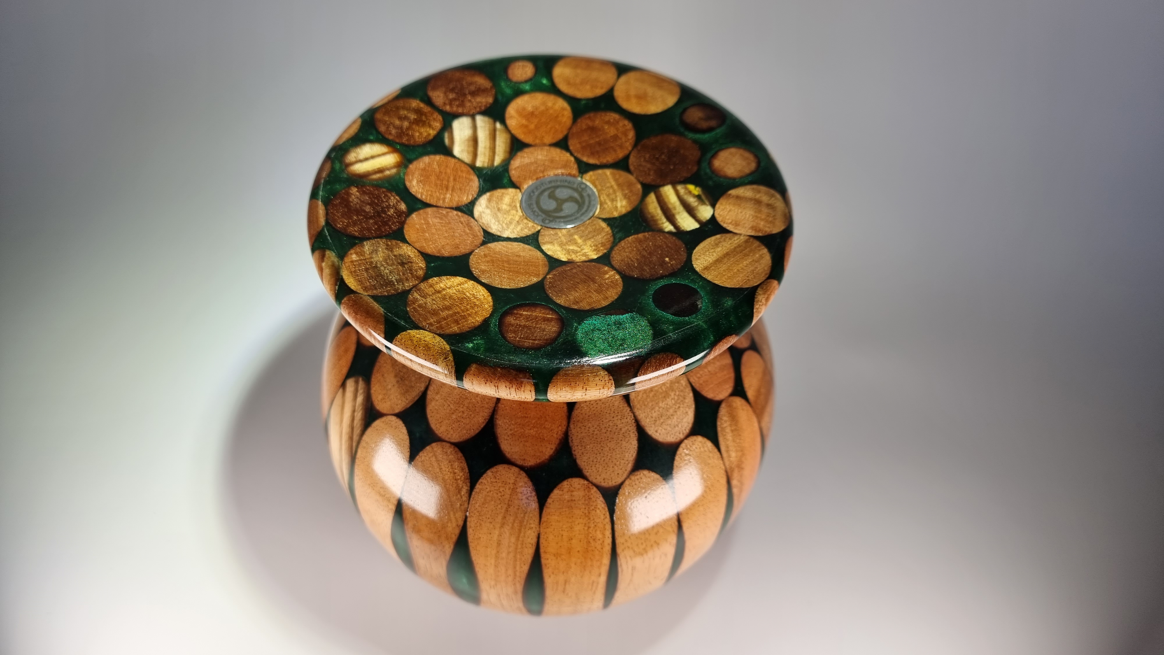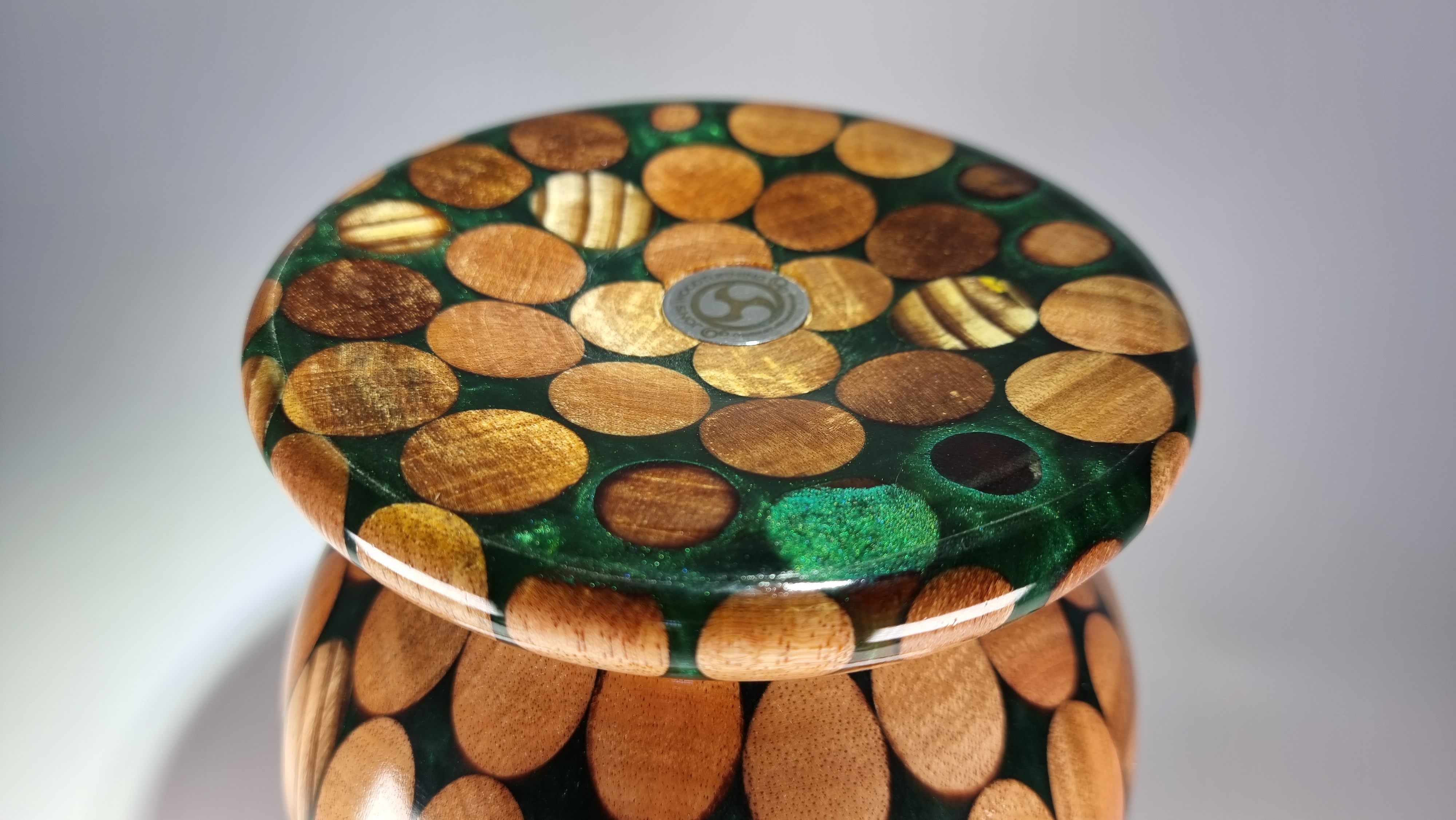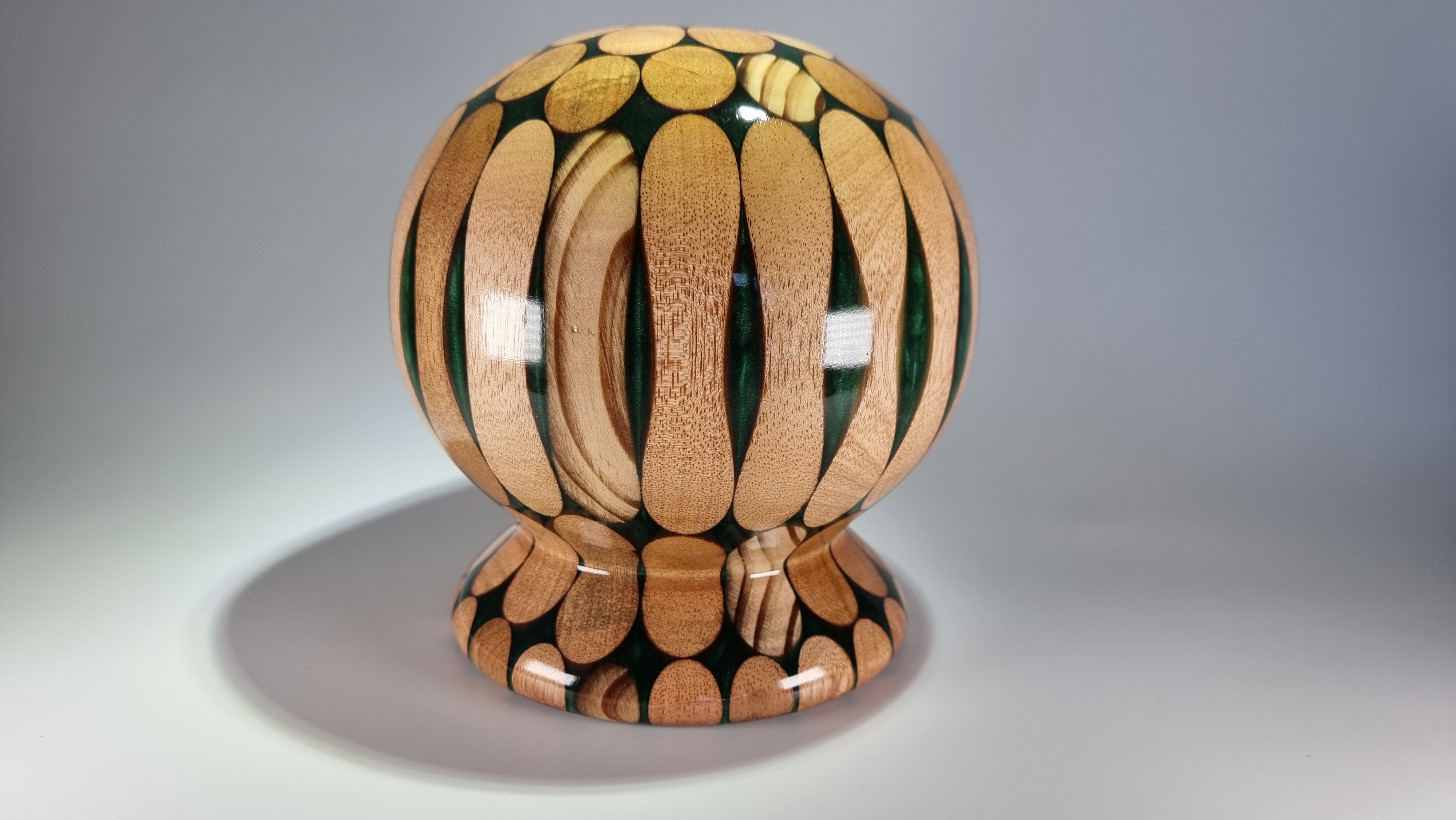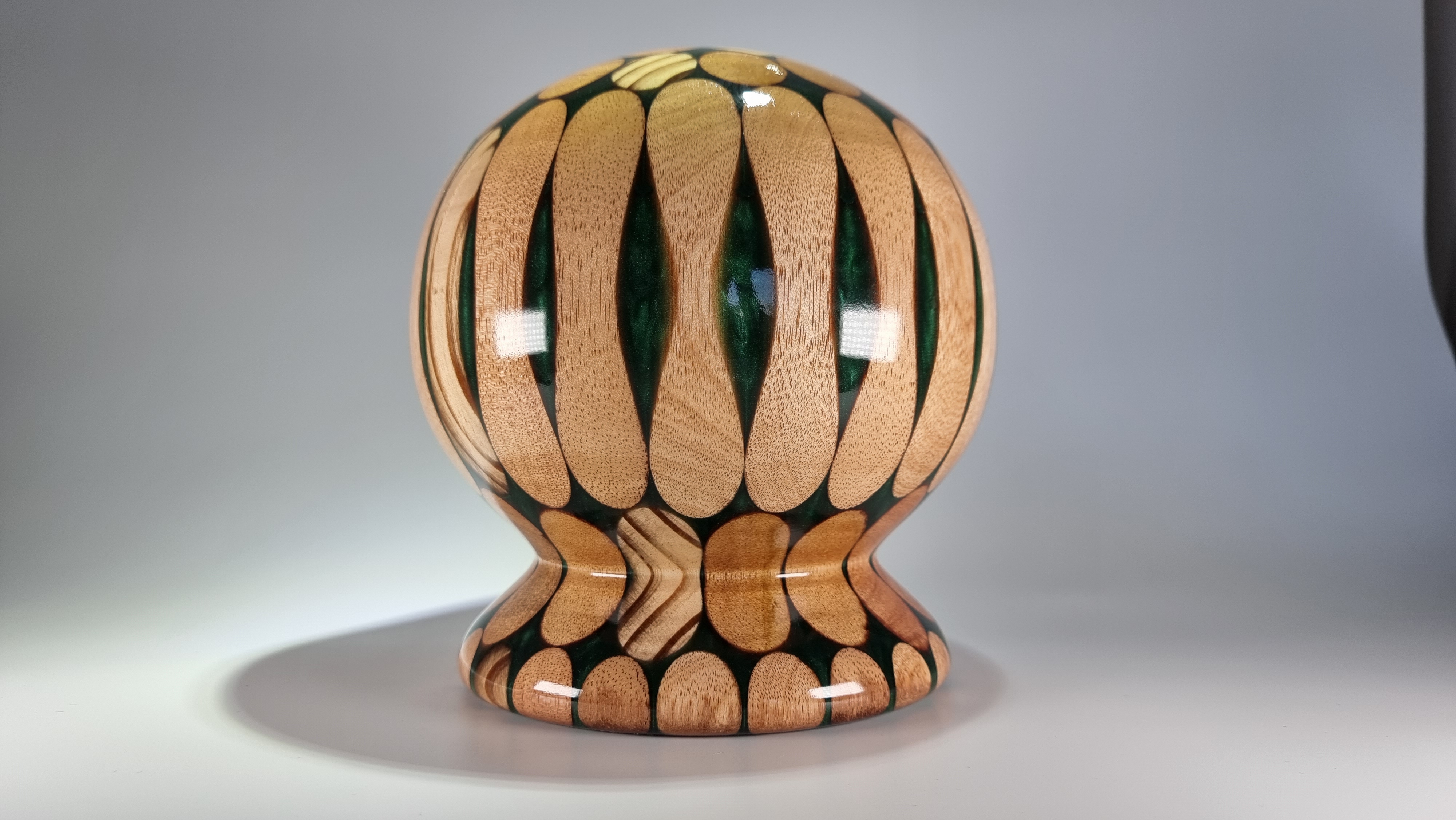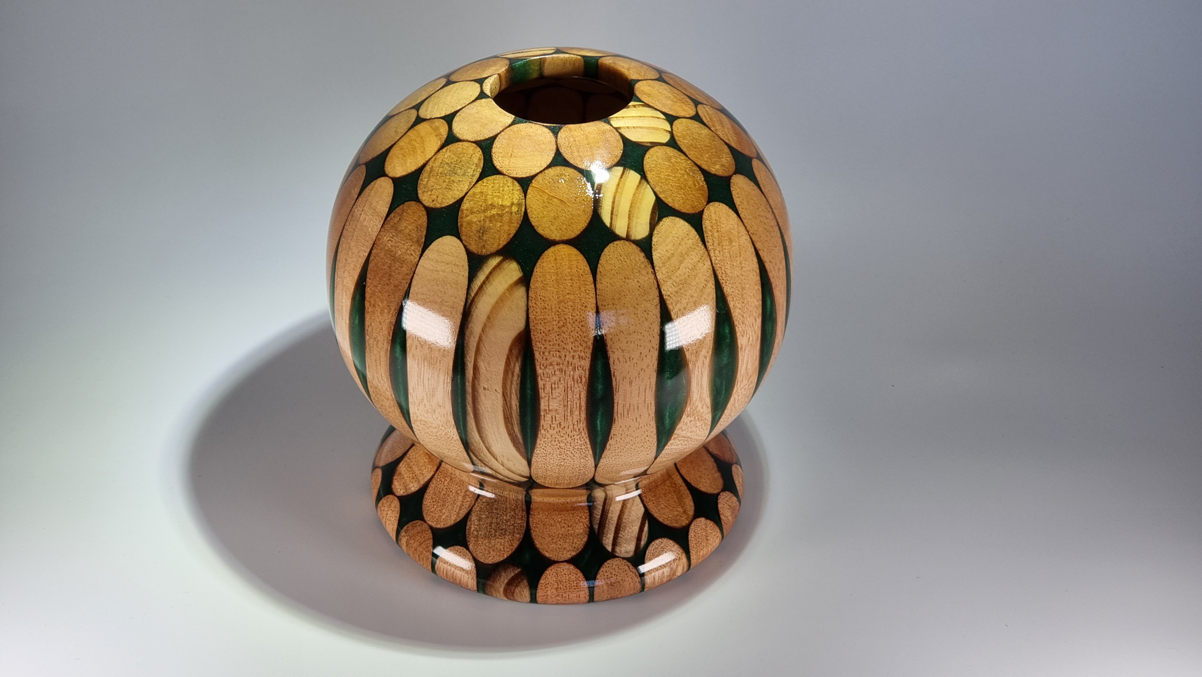 This piece is turned from 10 hardwood broom handles cast in forest green resin and finished in a clear lacquer coat . Unusual but a striking centre piece or for use with dry flowers.