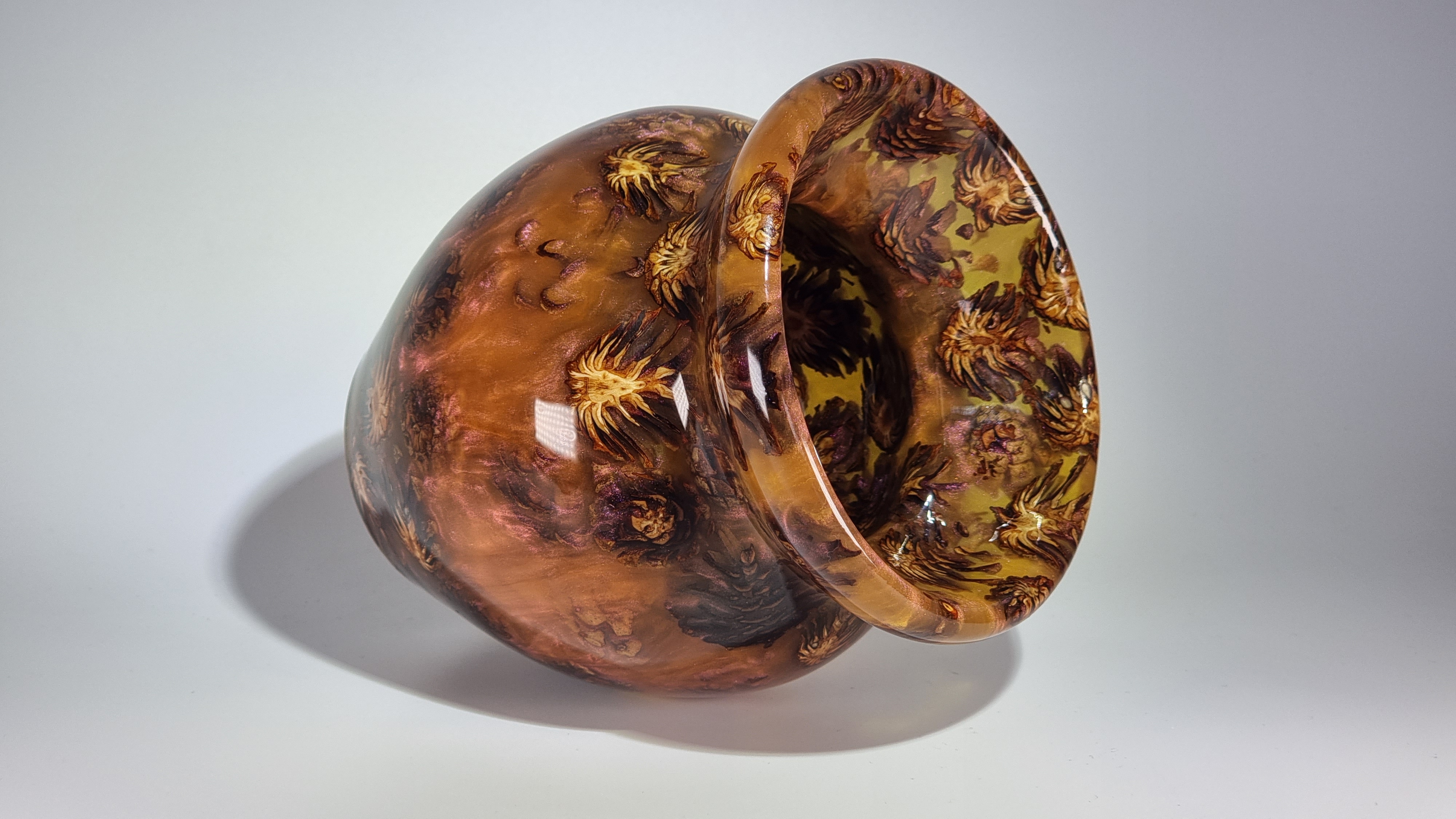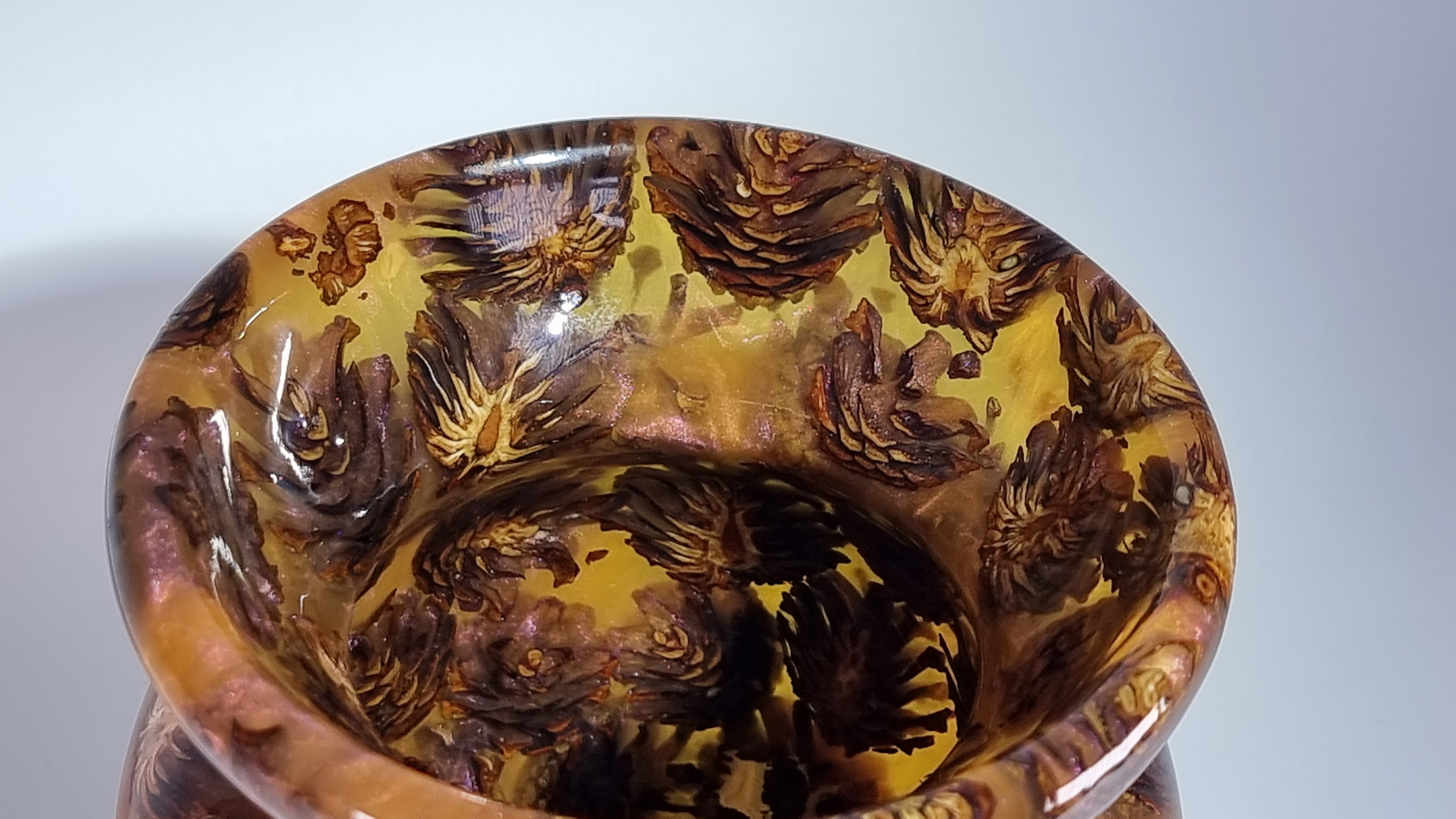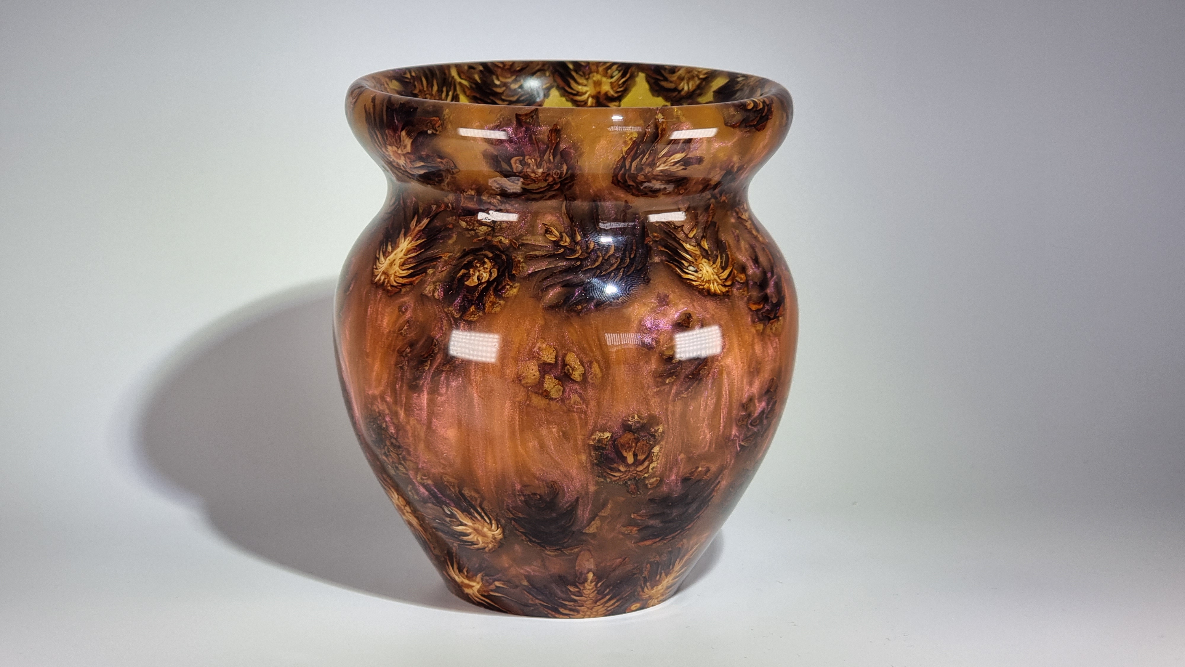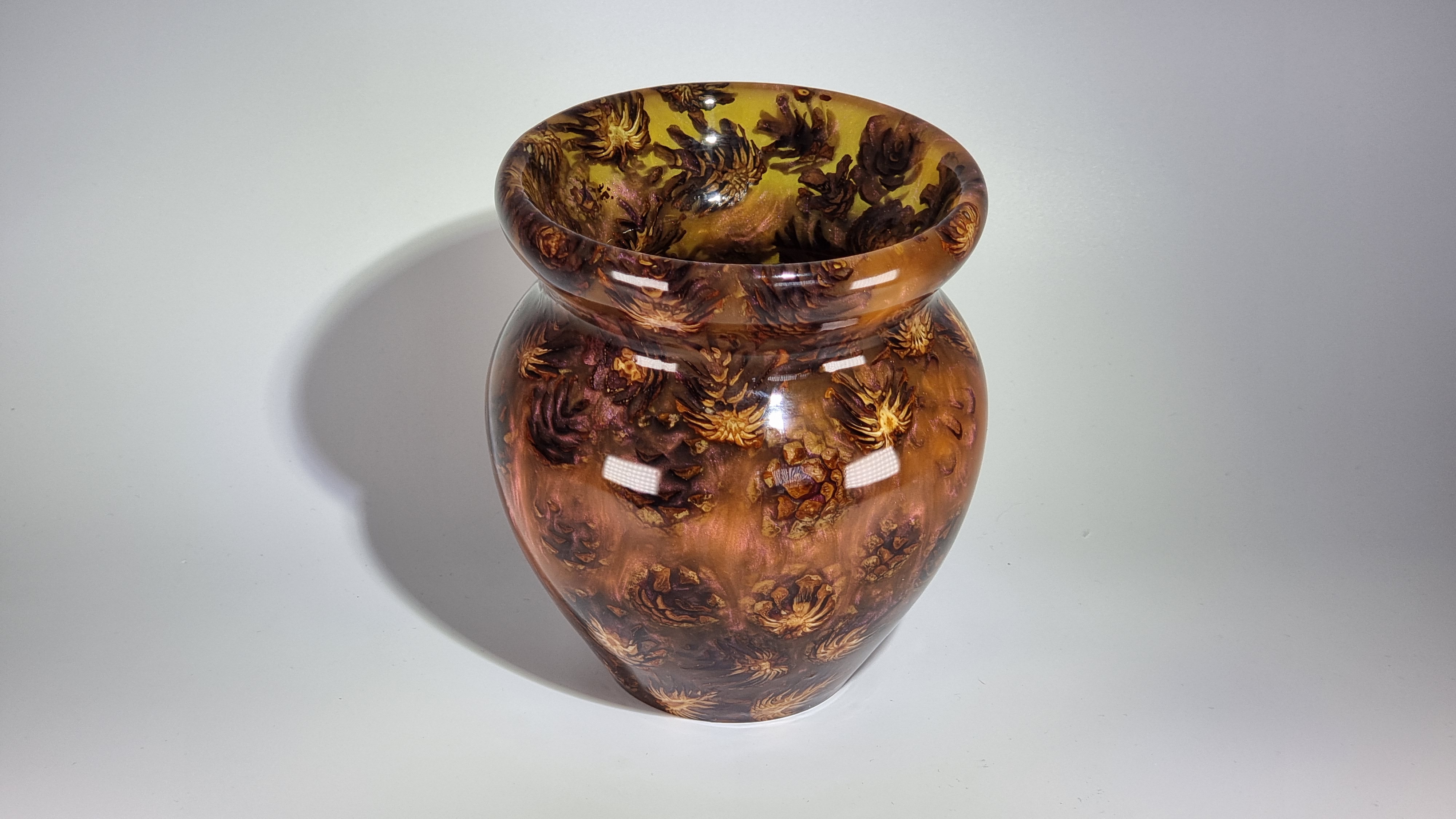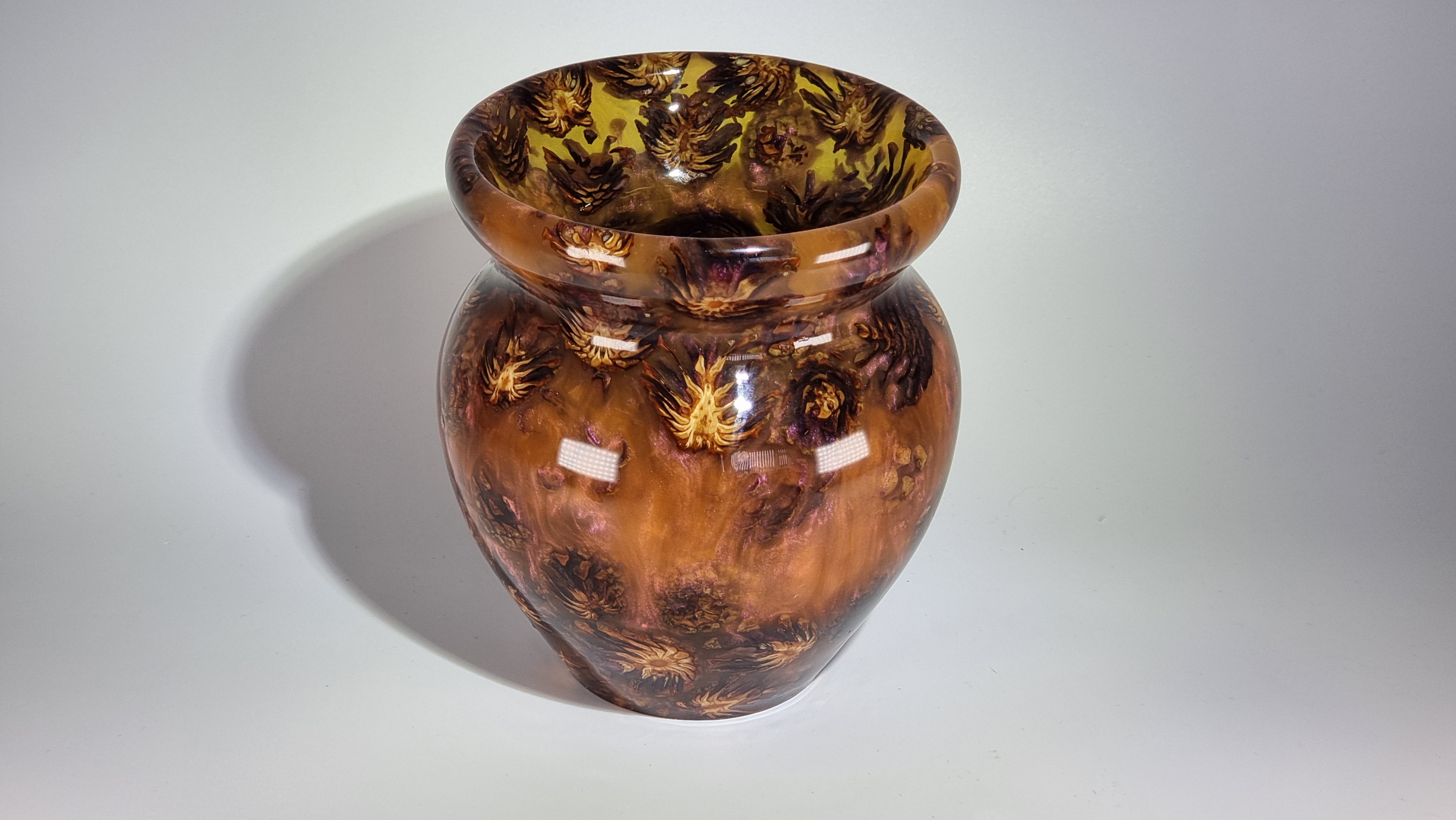 A stunning little vase with phoenix orange resin and miniature pine cones, orange but goes purple as the light catches it in places. in a clear resin gloss coating for use with dry or wet flowers.
