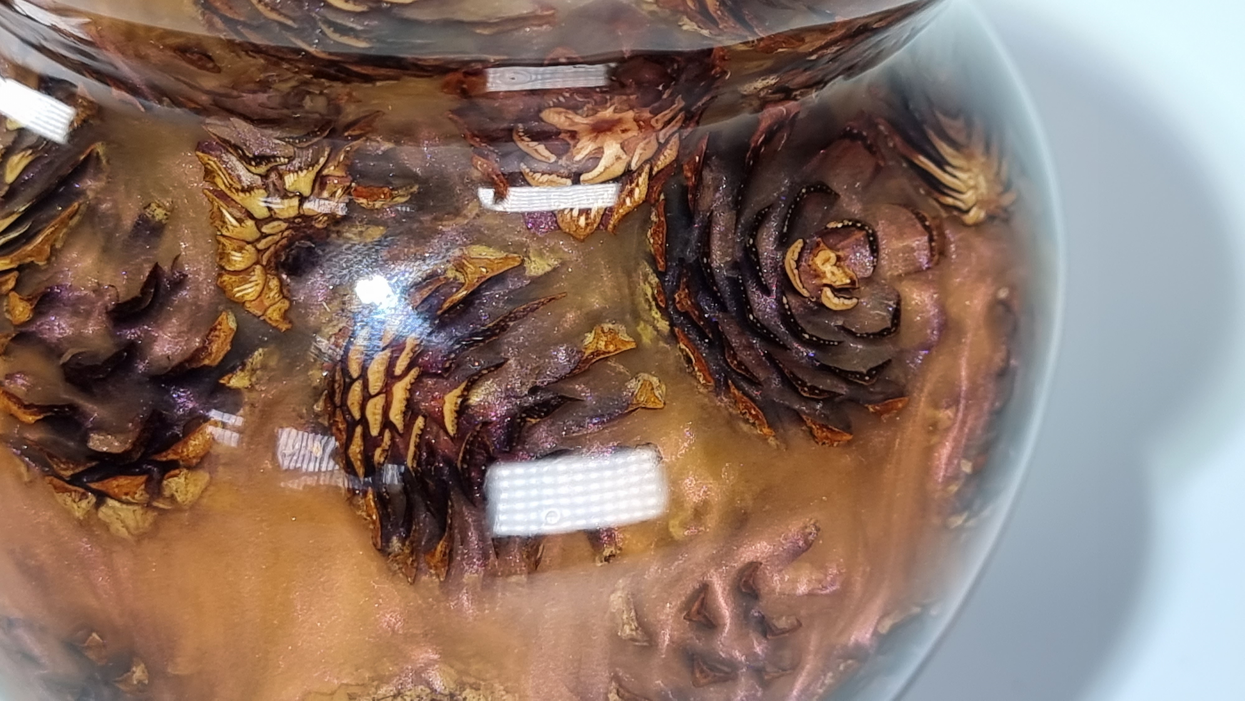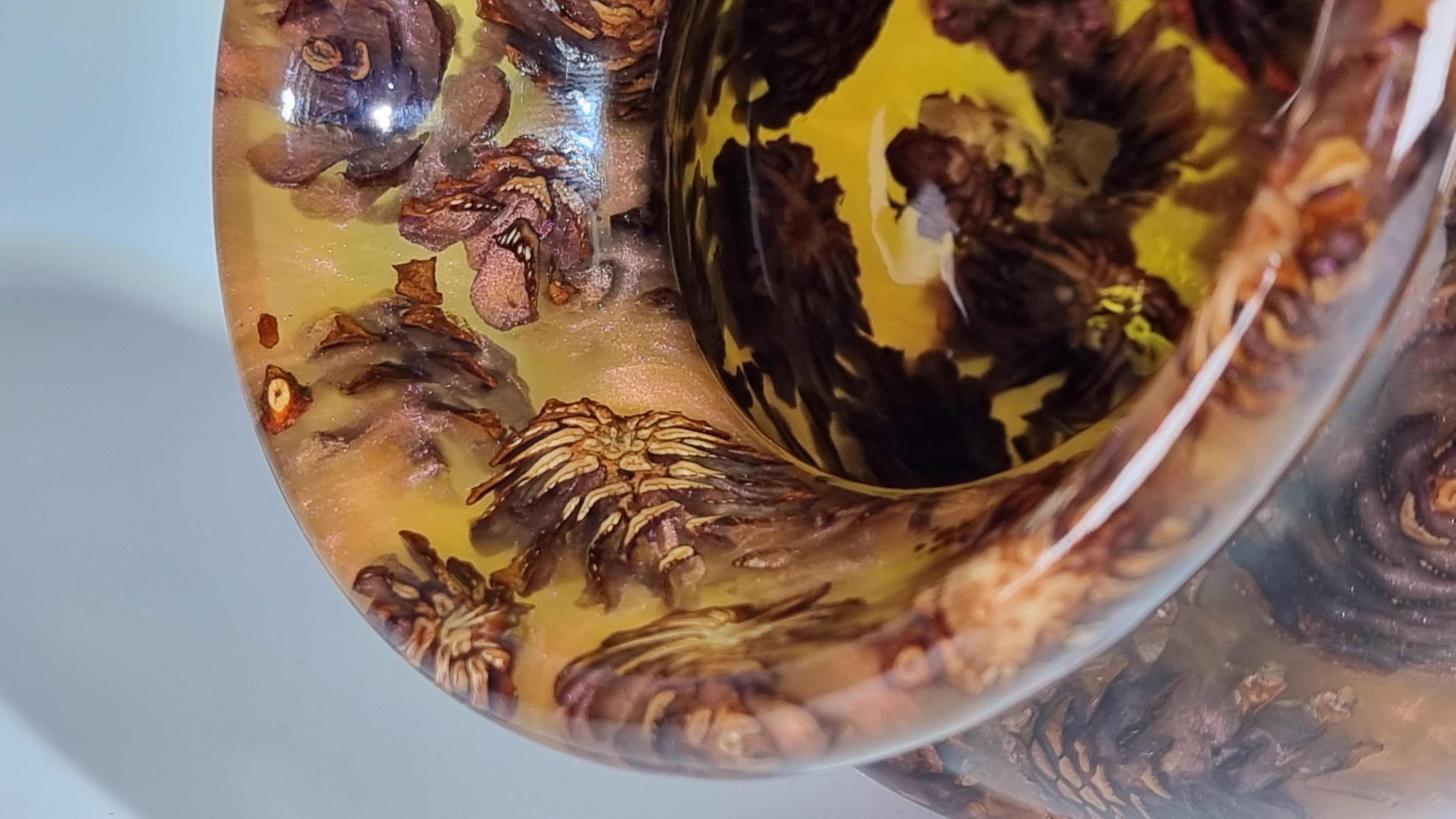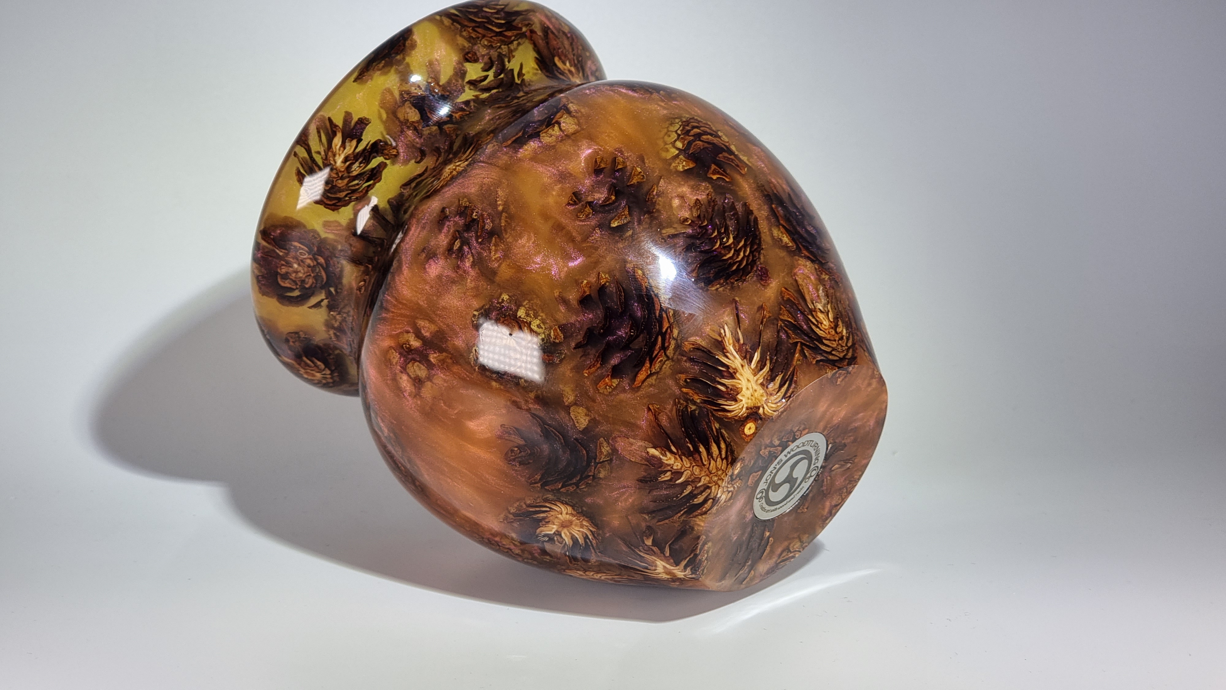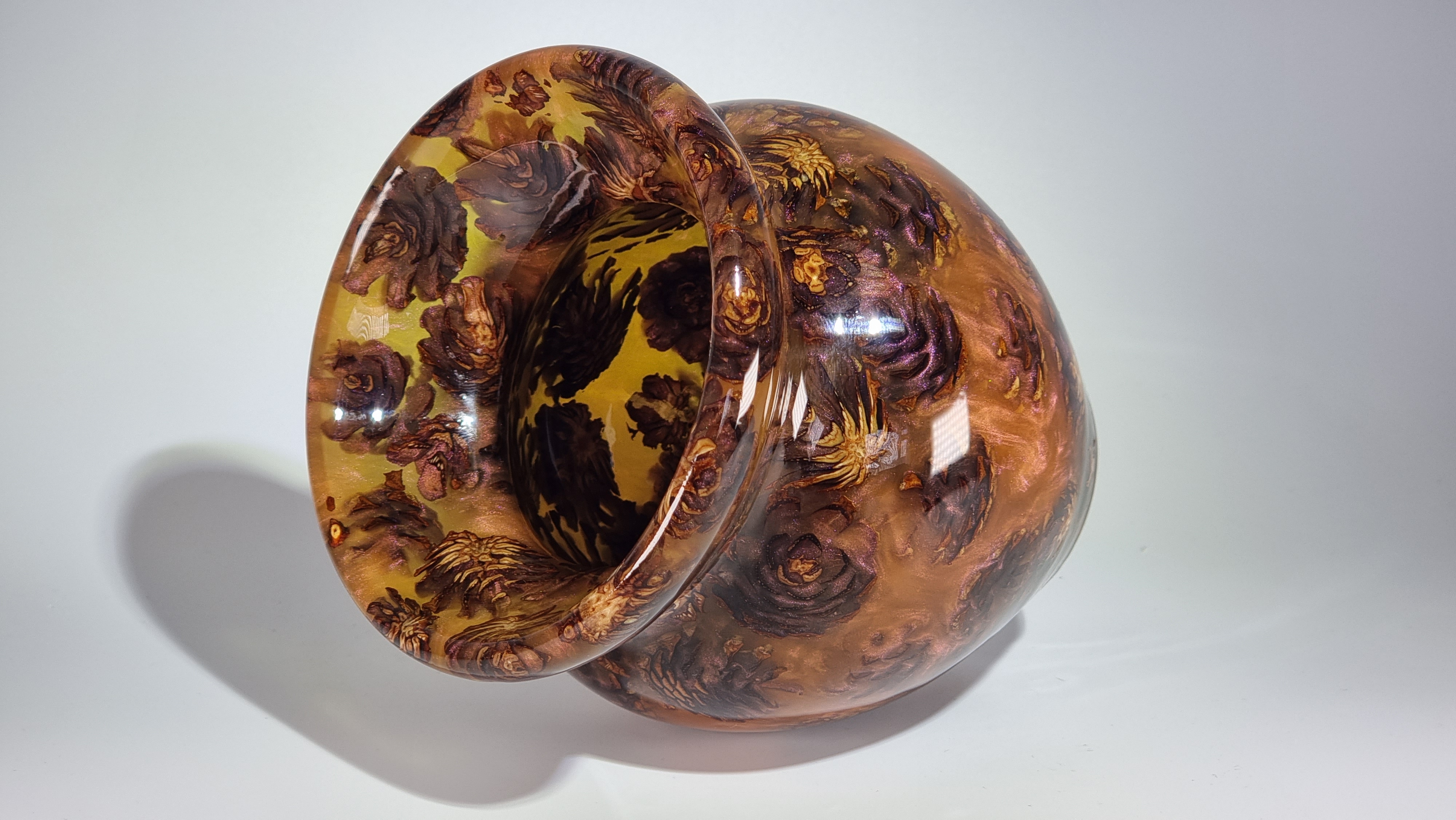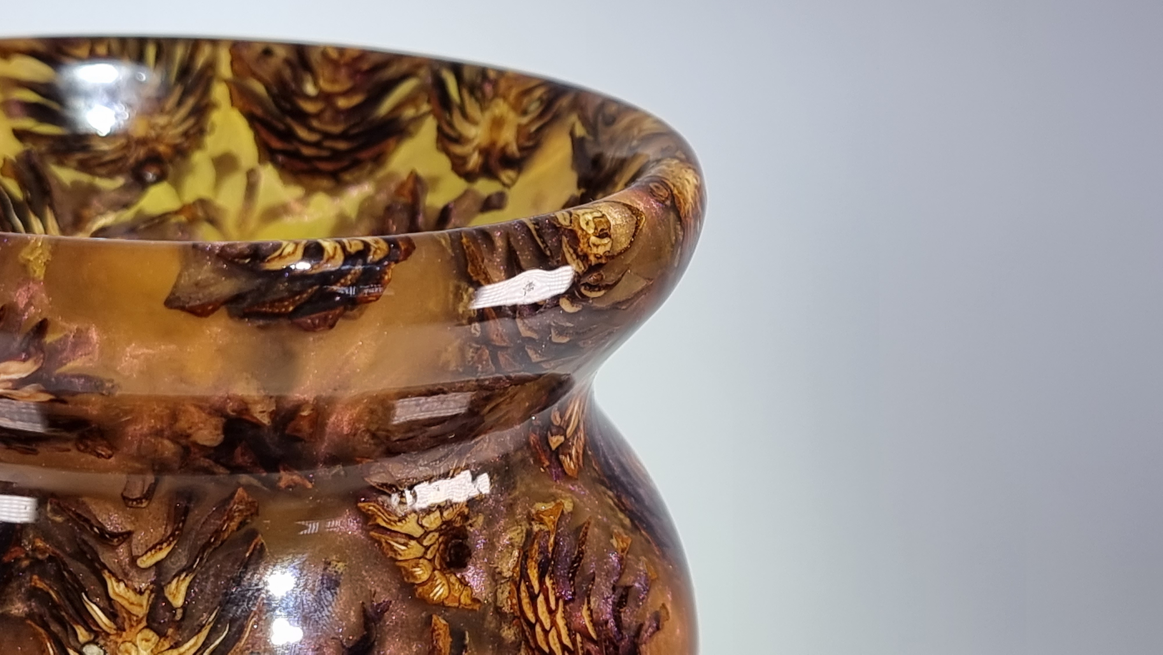 A stunning little vase with phoenix orange resin and miniature pine cones, orange but goes purple as the light catches it in places. in a clear resin gloss coating for use with dry or wet flowers.
