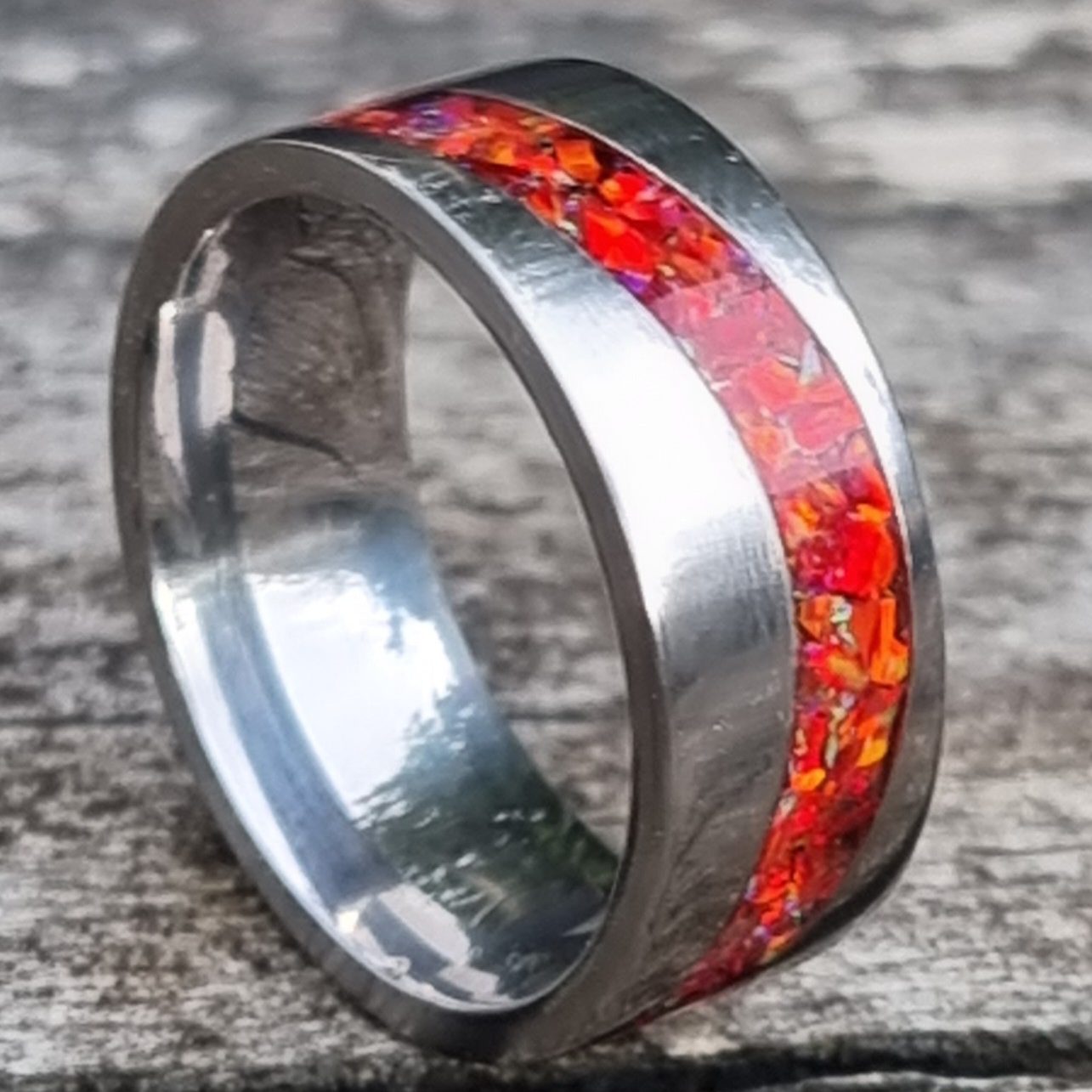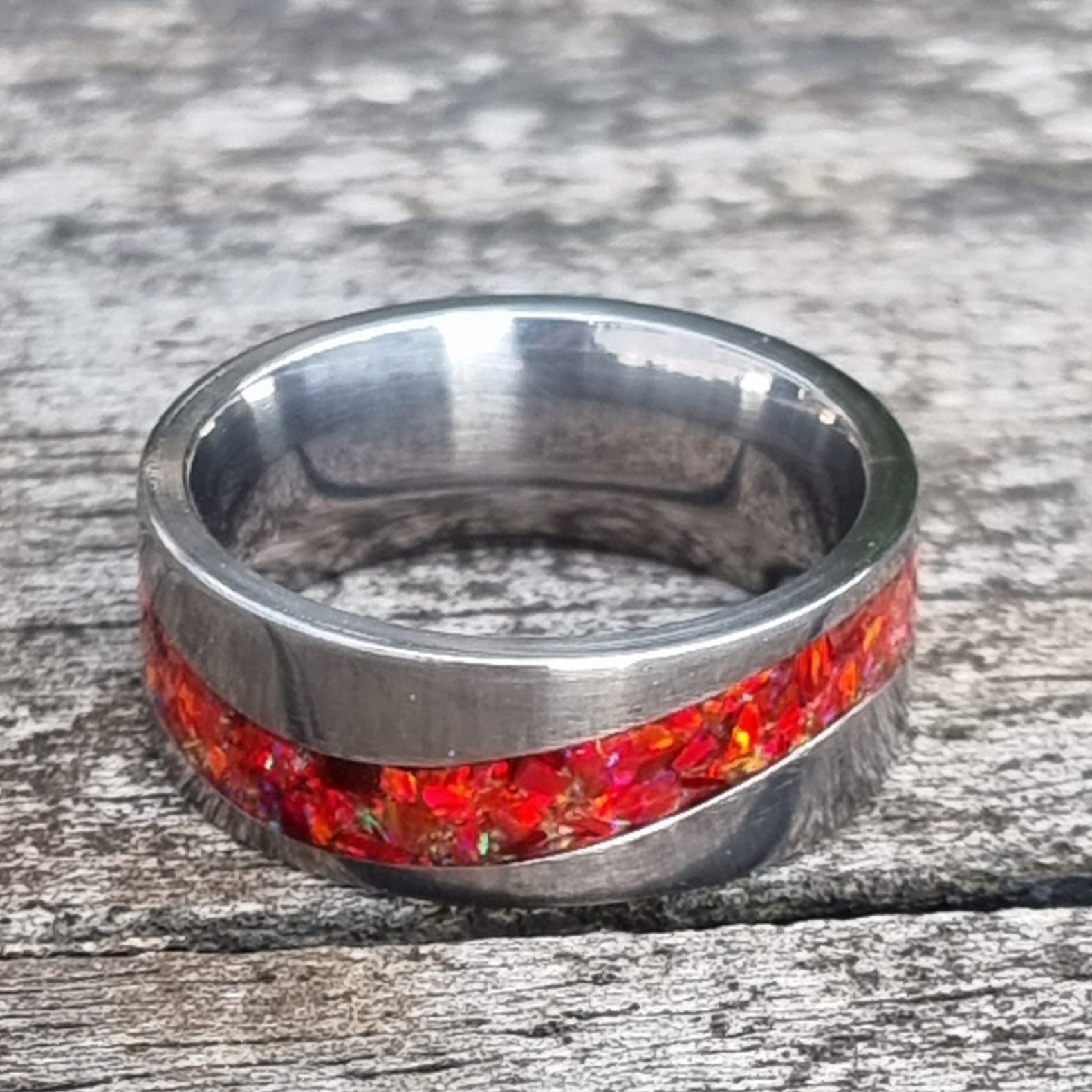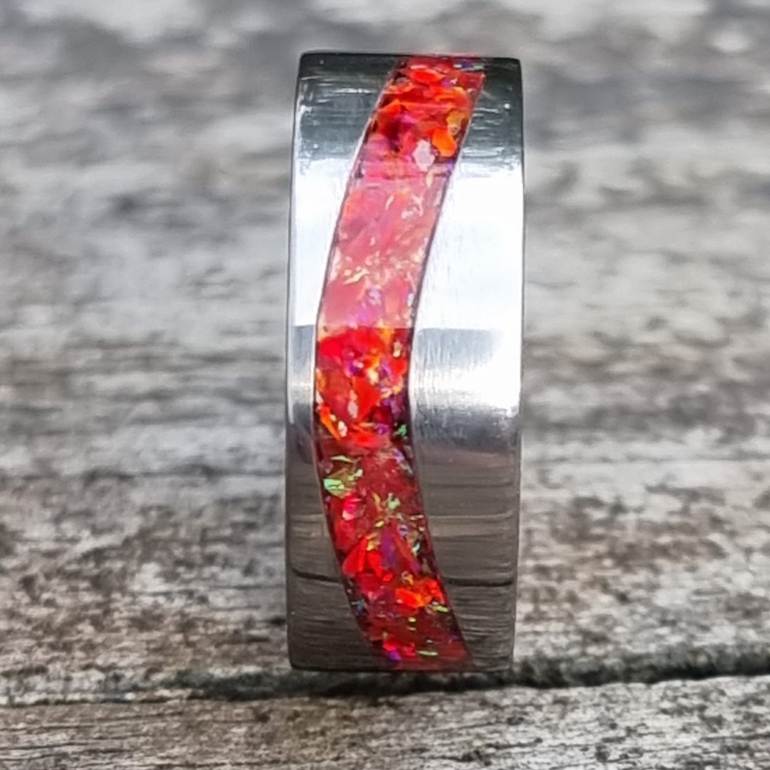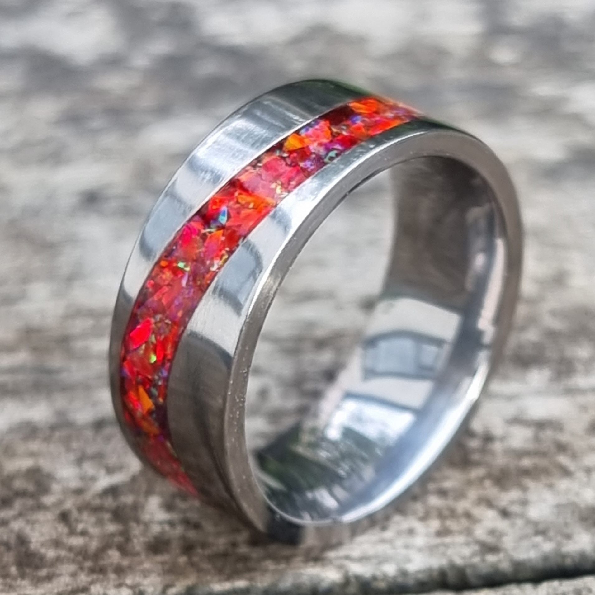 Titanium wave opal inlay ring. comfort fit 8mm width with a choice of opal colour inlay also these rings can be combined with memorial ashes made to order available in US sizes 6 to 13. Extremely light weighing a little over 4 grams. From £140 contact me for details