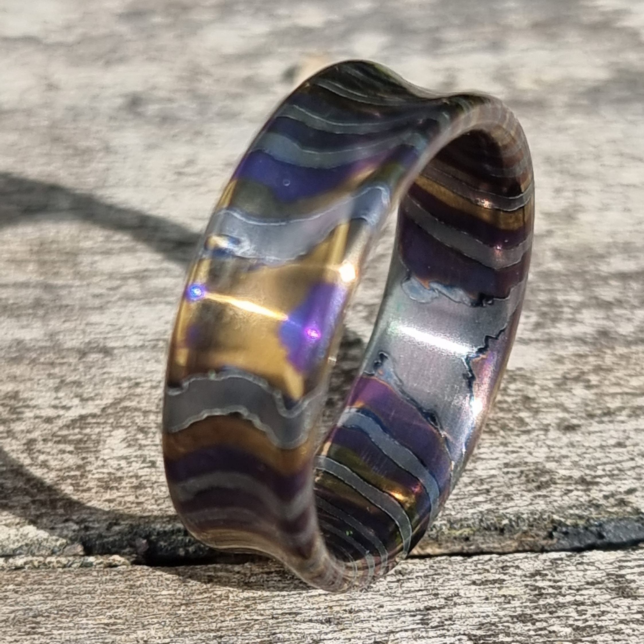 Hand made bespoke to order Zicuti is a very special type of Damascus, a mixture of titanium grade 2,5,7 and 9, Zirconium is an extremely corrosion resistant material that turns deep black when heated. I can make these rings in any shape size from 10mm to 4mm wide in rounded, inverted as pictured, bevel edge, obsidian etc, A complete design and build which would need a sizing visit to produce the perfect fit of your ring and various different colours can be achieved during the heat anodising process, from £250 contact me for details.